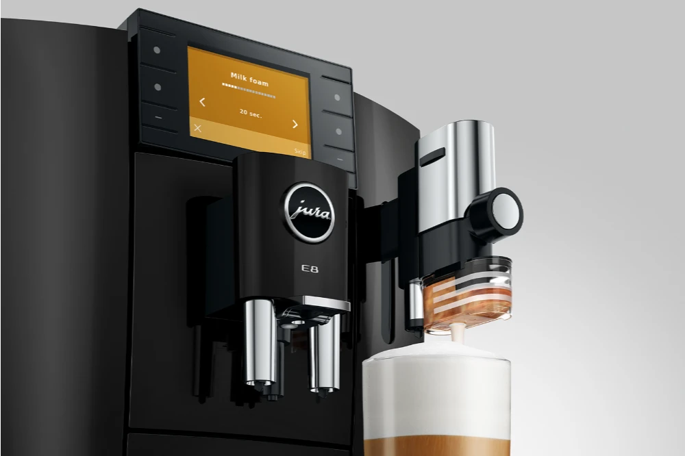 Aby zvládl tento všestranný zážitek z vaření, je E8 obeznámen se všemi standardy JURA a také integruje proces lehké extrakce. Klasicky vaří horkou kávu pro intenzivní chuťový zážitek a extrahuje světlou kávu při teplotě kolem 60 °C pro lehký nápoj připravený k pití. Ať už je horká nebo lehká – obě varianty těží z funkce sladké pěny, která nabízí ještě více chuťových zážitků.